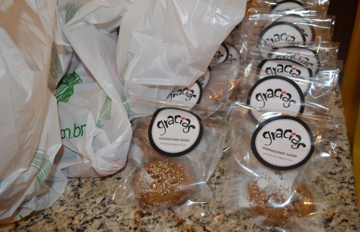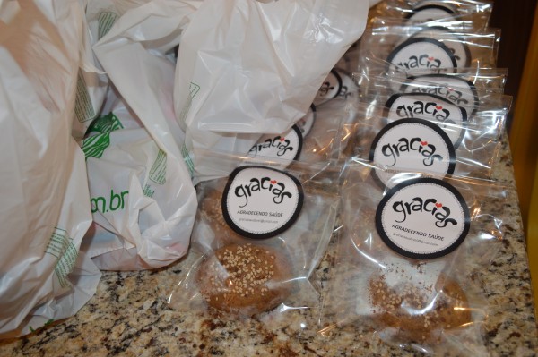 No final, ganhamos uma sacola da Organomix, que é um supermercado que vende e entrega produtos orgânicos, com um pacote de biscoito de polvilho Creck Creck de linhaça, uma barrinha biO2 Fruits da biO2 Organic e um pãozinho sem glúten e sem lactose da Gracias.